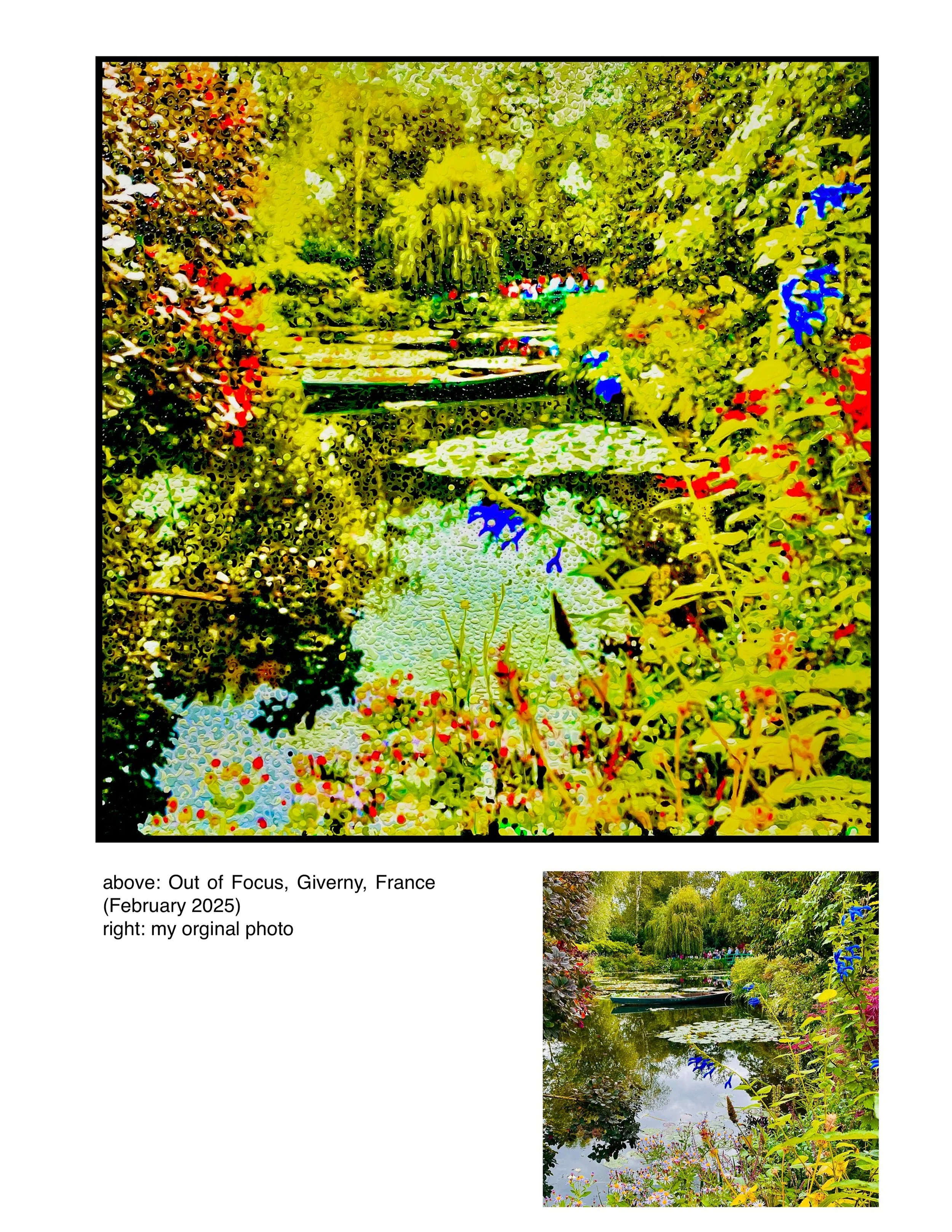 I use these photos as the basis of my art. I enlarge them, mount them on canvas, and then apply acrylic paints to create something new. I add dots and pour paint to enhance details, create a three-dimensional quality, and modify shapes and lines. My goal is to create new ways of seeing these scenes from nature. I consider this process a deconstruction of the original image.